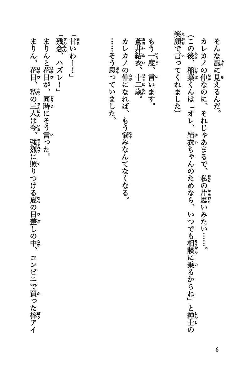 大ヒットコミックのオリジナル小説第3弾! 大人でもない、子どもでもない---そんな微妙なお年ごろ、12歳。小学6年生の結衣・花日・まりんは、同じクラスの親友同士。結衣には桧山、花日には高尾という彼氏がいます。いわゆる“カレカノ”なんだから、毎日さぞかし楽しいことばっかりなんじゃ……?って思うかもしれないけど、そんなことはありません。両思いになったらなったで、悩みはつきません。そして、そんな結衣と花日に“恋愛マスター”としてアドバイスを贈るのが、まりんの役目なのです。