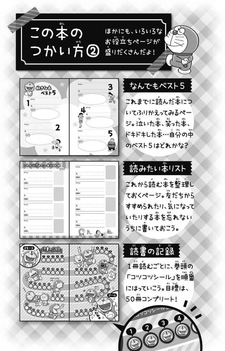 50冊読破を目標にした、1冊ずつの「記録ページ」のほかに、5冊読むごとに本にまつわるドラえもんコラムが読める「ごほうび」ページ、シールを貼って楽しむ「読書の記録」ページ、ほかにも読んだ本を振り返って自分の中でのランキングをつける「なんでもベスト5」ページ、そしてこれから読みたい本をリストにしておける「読みたい本リスト」ページなど、読書をより深く楽しめる仕組みがいっぱいの1冊!