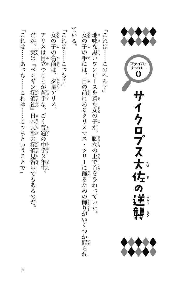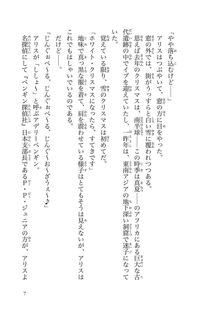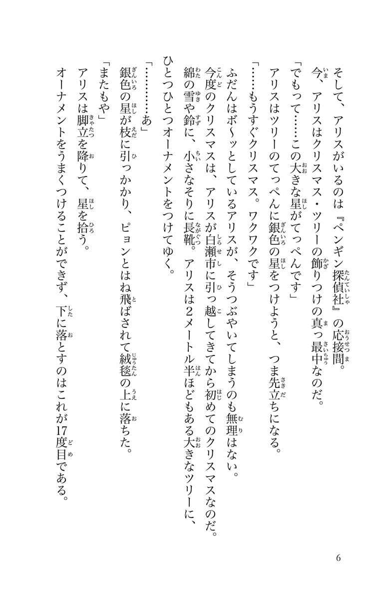 大人気アリペン10巻は記念パーティです! アリスがペンギン探偵社に来てから、初めてのクリスマス! わくわくしながらししょーとパーティの準備をしていたところに、事件発生の連絡が舞い込んだ。どうやらサンタクロースが誘拐され、トナカイたちが困っているらしい。クリスマスで町中にサンタがいるなか、鏡の国でアリス・リドルに変身し、パーティまでに華麗に解決できるか…? ほかにも、ヘンテコ裁判で鏡の国から出られなくなったり、やまない大雪に『北極強盗団』が現れたり、ペンギン探偵社は大忙しです!