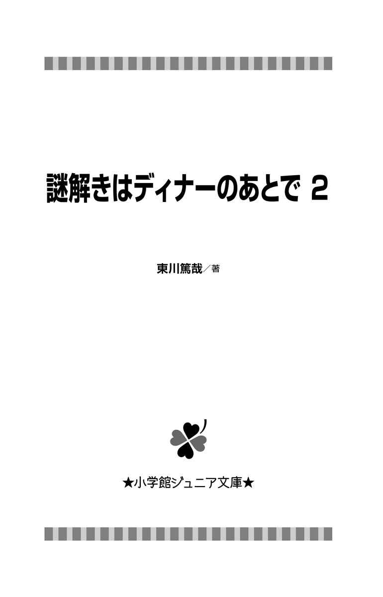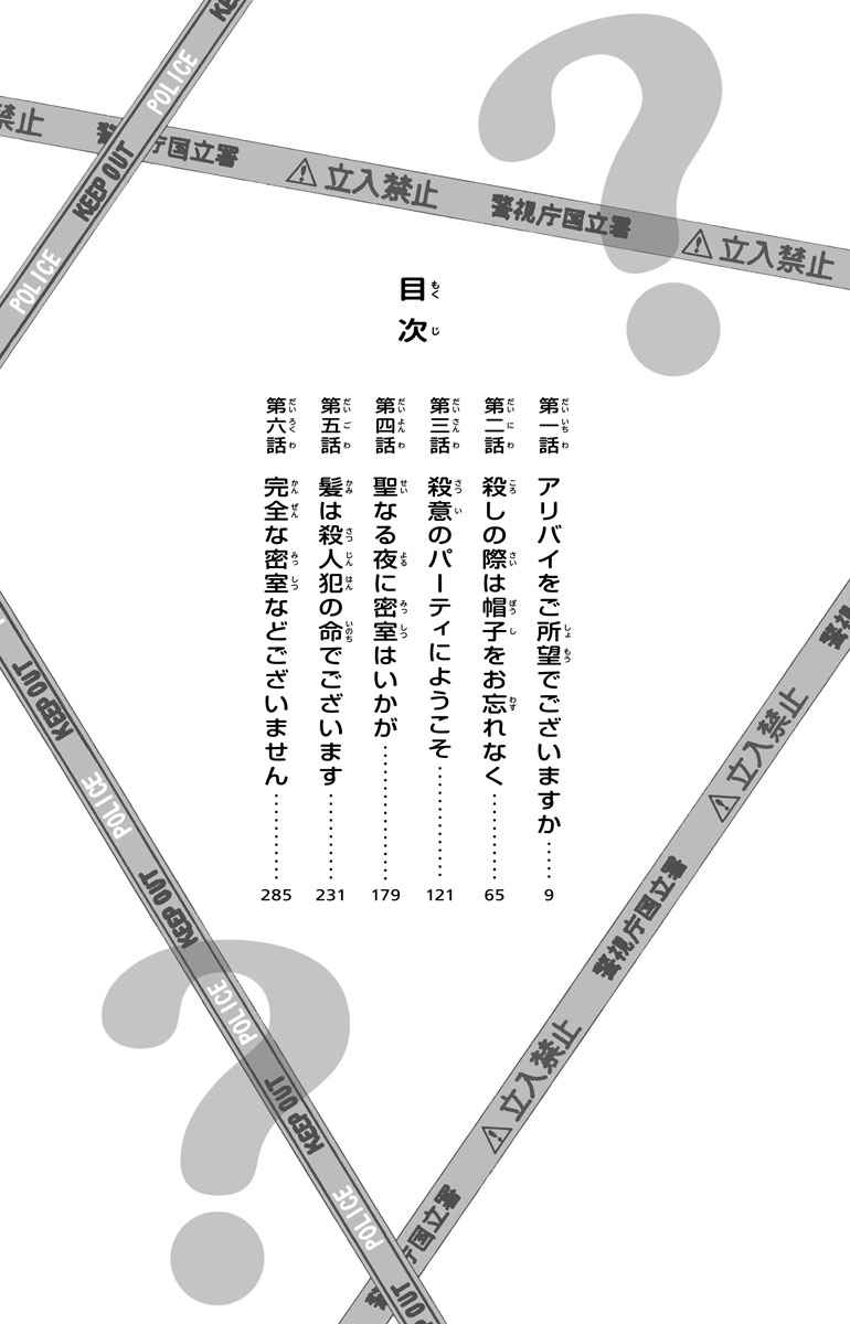 その他、「殺意のパーティにようこそ」「聖なる夜に密室はいかが」「髪は殺人犯の命でございます」「完全な密室などございません」の全6編。