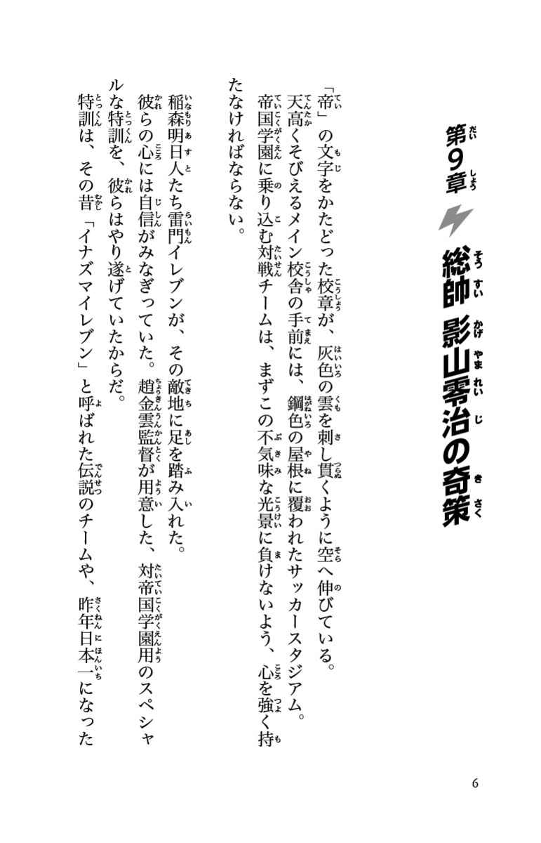 大人気アニメノベライズ第2弾! 伊那国中から昨年の優勝校・雷門中に転入したイレブンたち。謎の中国人監督、趙金雲のこれまた謎の特訓と戦略によって、少年サッカーの大会「フットボールフロンティア」の予選を雷門イレブンはなんとか戦っていく。しかし次の相手は、サッカーの超名門校である帝国学園。万全の準備をして帝国学園戦にのぞんだ雷門イレブンだが、相手チームの予想だにしない動きに困惑することに・・・・・・。悪名高き監督・影山零治の指揮下で帝国学園イレブンに何が起こったのか!?