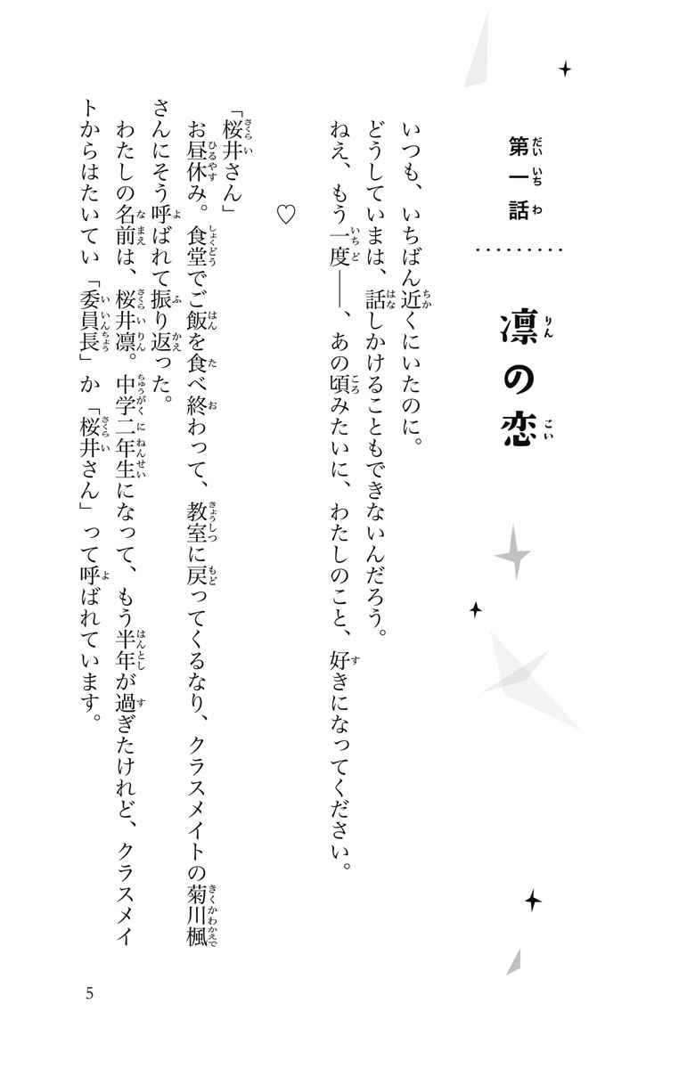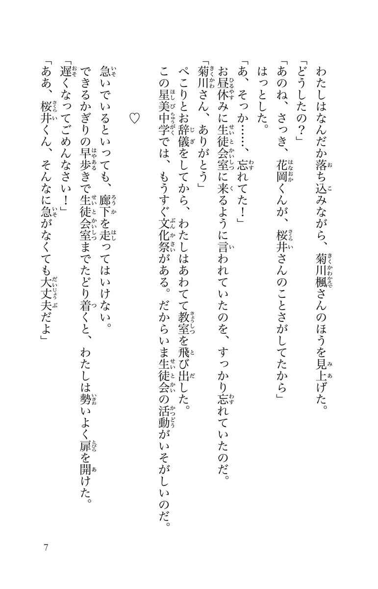 ジュニア文庫が初恋を応援します! わたし菊川楓には、ずっと好きな人がいる。幼なじみの陽太。でも好きな人の前で、全然可愛くいられないし、告白なんて無理! でも一番の仲良しの夢ちゃんが、「陽太くんのこと、好き。協力してくれないかな?」と相談してきて…。友達と好きな人が同じだった菊川楓。ふられてしまったけど、まだ好きが続いている、桜井凛。美人な彼女がいる先輩を好きになった、柄本結。