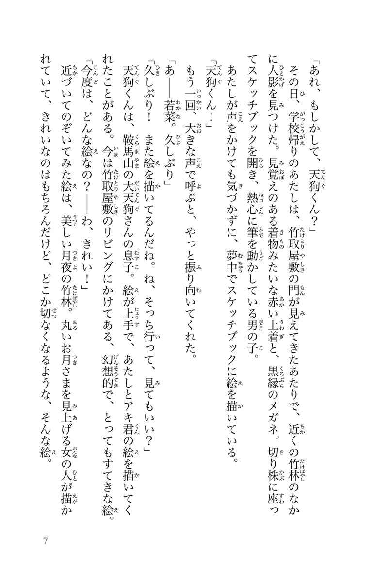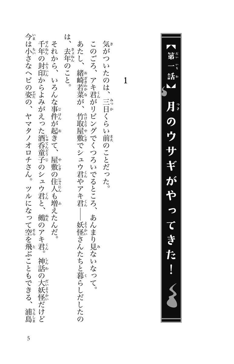 ジュニア文庫の大人気妖怪シリーズ! もふもふ妖怪の鵺(呼び名はアキ君)の元気がない。満月が近づいていて、かぐや姫のことを思い出しているみたい。会えなくなって千年たっても、ずっと――。そんなアキ君を見て、しんみりしていた若菜の前に月のウサギが現れた! そして、若菜をかぐや姫だと勘違いして、月につれて行こうとする。竹取屋敷の妖怪たちは必死にとめるけど、連れ去られてしまい!? そのほか、竹取屋敷が取り壊しの危機にあったり!? 緒崎さん家は、今日も妖怪が起こす事件でドタバタです!