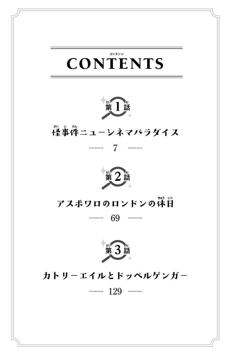 助手のノアやしゃべる犬のシャーロと一緒に、ロンドンでナゾトキをする日々を送っている。今回のナゾは、映画から盗まれたキスシーン、アスポワロ警部の大変な休日、ドッペルゲンガーに悩まされるピアニスト…。