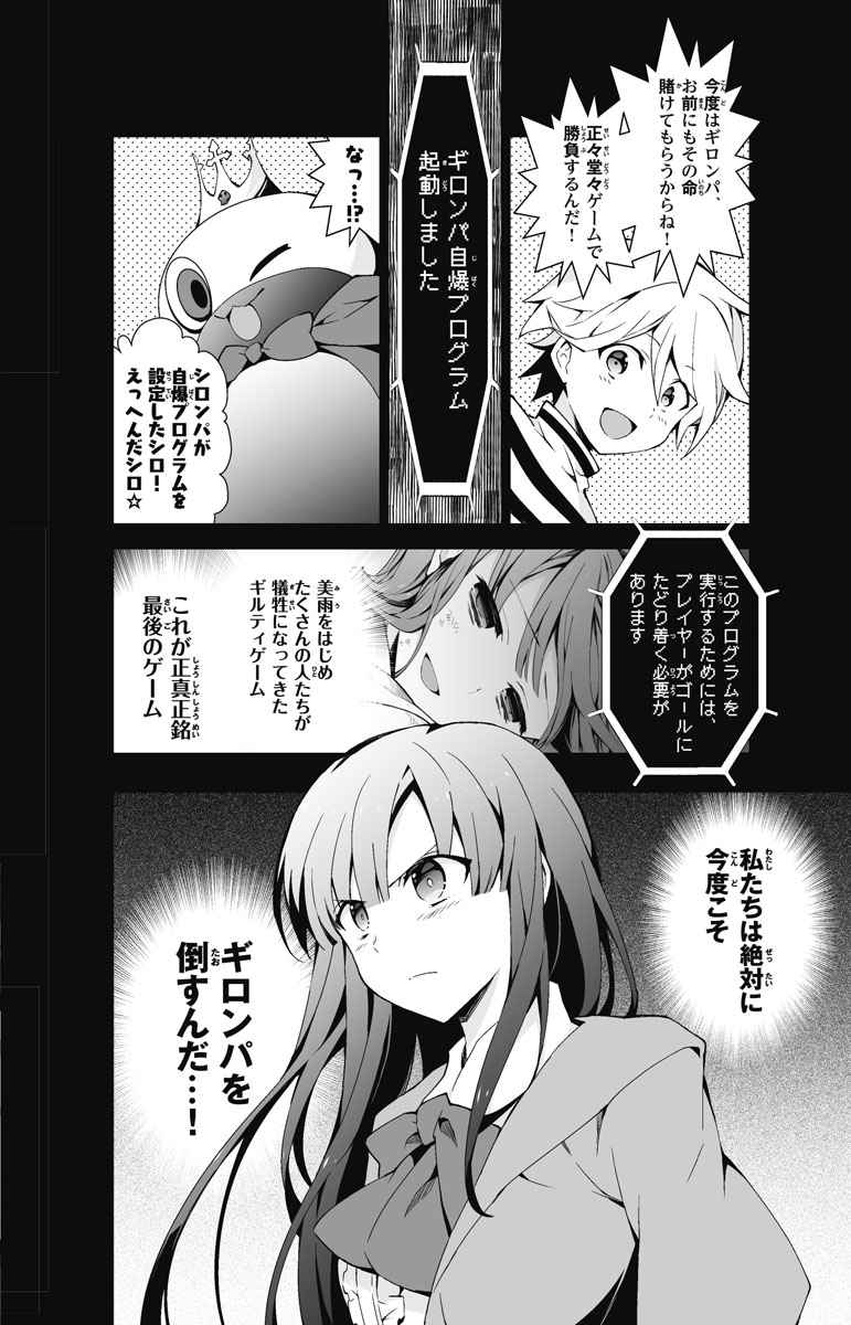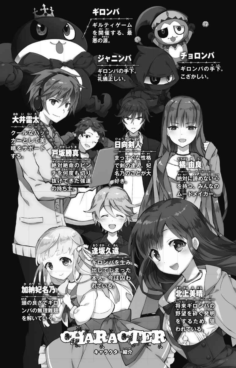 ギロンパに勝ち、全員生き残る? ギロンパ様に逆らう、北上美晴たち6人のせいで、完璧だったギロンパ帝国が揺らぎ始めて、ギロンパはぷんぷんだロン! だ・か・ら…ギロンパは決意しました☆ ギロンパ帝国の国民をたっくさん巻き込んだ、最後のギルティゲームを開催して、邪魔な奴らを一網打尽にするロン! 頭脳をつかっても、体力をつかっても、運をつかっても、絶対にクリアできない絶望仕様だロン!