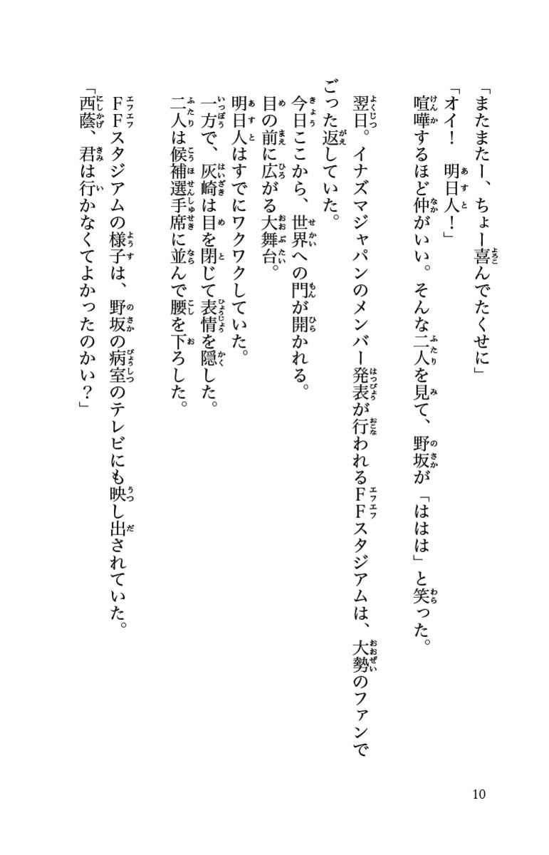 イナズマジャパン、世界へ!! 「アレスの天秤」でともに戦い、本気でサッカーをプレイすることの楽しさを分かち合った明日人、灰崎、野坂たちは、日本代表「イナズマジャパン」に選抜され、世界の舞台に立つことになった。しかし、初戦で、相手チームの不可解なプレイが続き、エースの豪炎寺が負傷、戦線離脱してしまう。