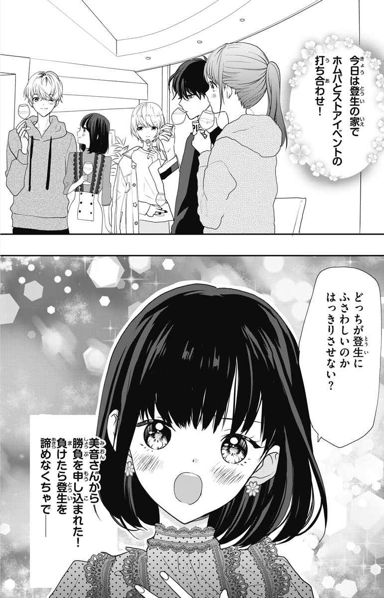 今日は人気モデル(そしてナイショの彼氏!)の登生の自宅で、Rippleのモデル仲間とホムパをしながら、ストアイベントの打ち合わせ! 登生の部屋でおそろいのバングルを貰って、すごく幸せだったのに、登生を好きなメインモデルの美音から、イベントでの洋服の売り上げ対決を申し込まれた。負けたら、登生から身を引かなければならなくなっちゃって……!?