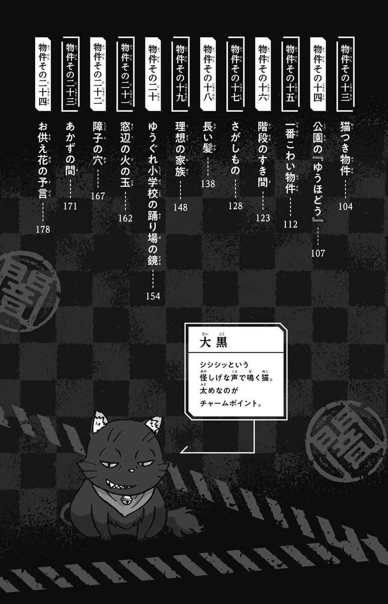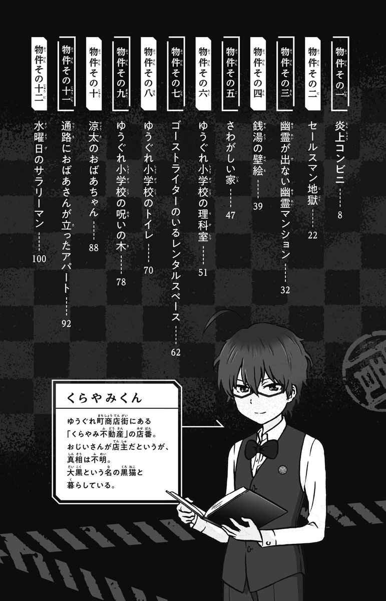幽霊が出る、原因不明の音がする、あかずの間があるなど、いわくつき物件だけを扱う「くらやみ不動産」。そこで店番をする少年店主くらやみくんとお客たちが遭遇するこわーいお話、全24編。