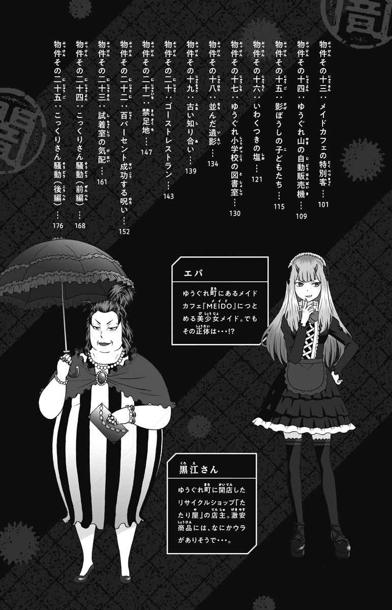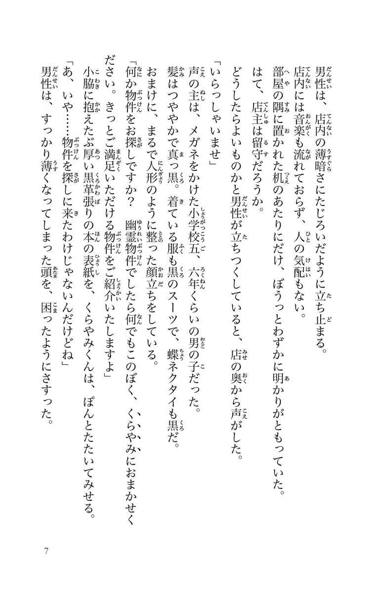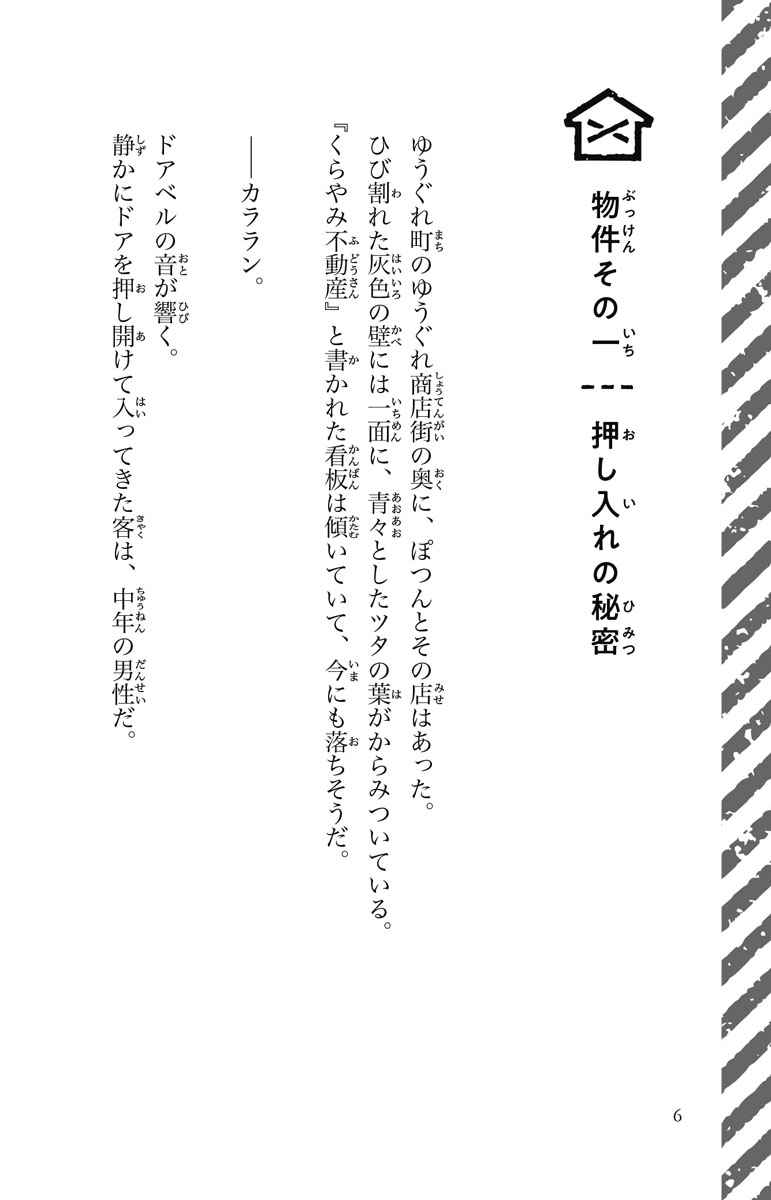 ゆうぐれ町にあるゆうぐれ商店街。そこにひっそり店を構える「くらやみ不動産」は、ただの不動産屋ではない。事故があったり、幽霊が出るなどのいわくつき物件だけをあつかう特殊な店なのだ。店番のくらやみくんと看板猫の大黒は、今日も店をおとずれるお客の相談にのるが・・・・・・。上を見上げてはいけない美容院、開けたはずなのにいつもカーテンが閉まる試着室など、怪現象に見舞われる物件をくらやみくんが紹介します。