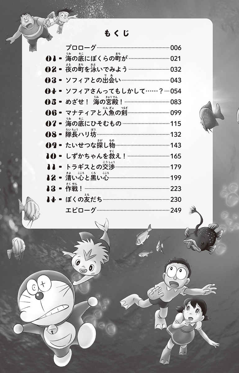 2010年の大ヒット映画をノベライズ! スクーバダイビングに行ったことを自慢するスネ夫をうらやみ、自分もダイビングがしたいと言い出すのび太。見かねたドラえもんはひみつ道具を使って町を架空の海にして遊ぶことに。そこへ人魚族の王女・ソフィアが迷い込んでしまう。人魚族はかつて住んでいたアクア星を怪魚族に汚染され、地球の海に移住してきた人々だった。ソフィアと友だちになったドラえもんとのび太たちは、海中を満喫していると、そこへ人魚族の“伝説の剣”を奪いに怪魚族の王・ブイキンがやってきて・・・。