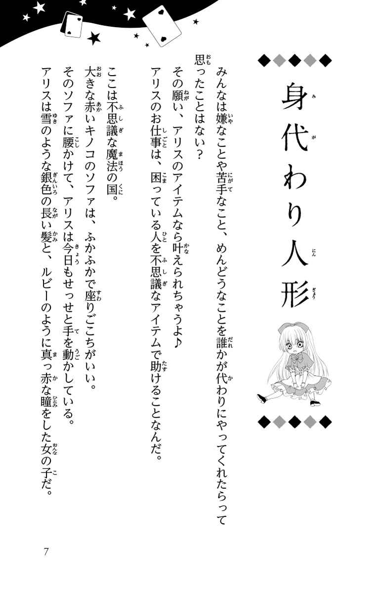 誰よりもかわいくなりたいとか、自分だけ良い思いをしたいとか、苦手なことを誰かに代わりにやってもらいたいなど、様々な思いを抱く少女たちに、アリスは願いをかなえるアイテムをそっと渡す。