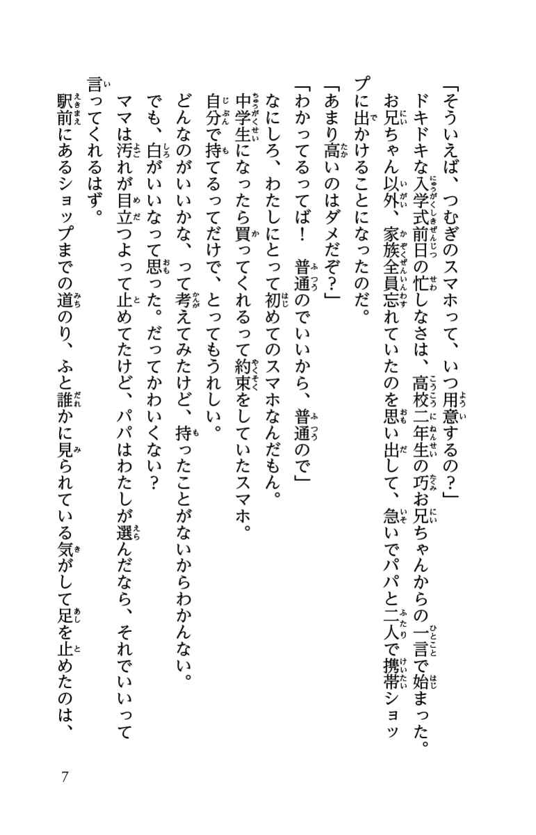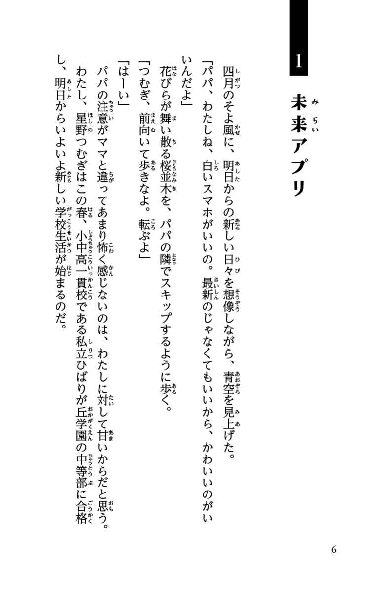 アプリが予言する不幸から、逃げられない 中学校の入学式前日、つむぎが初めて手にしたスマホの画面に、突然見知らぬアプリが現れた。それは、JCの間でも流行っている「未来アプリ」というもので、写した写真が”三日後の姿”として面白おかしく表示されるもの。
