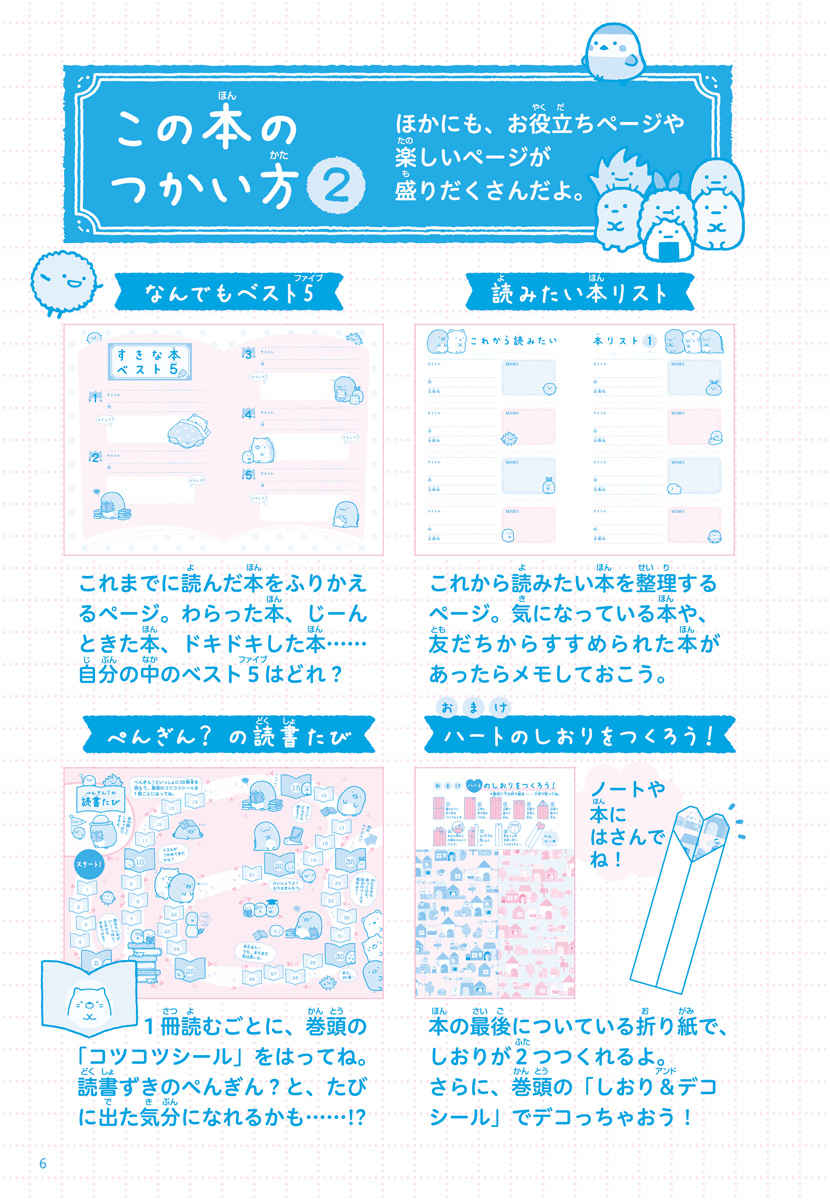 50冊分の本の記録が出来るようになっていますが、5冊ごとに”すみっコ”たちのヒミツに迫ったコラムが読めるようになっていて、楽しく読書が進められる仕掛けがいっぱいです。