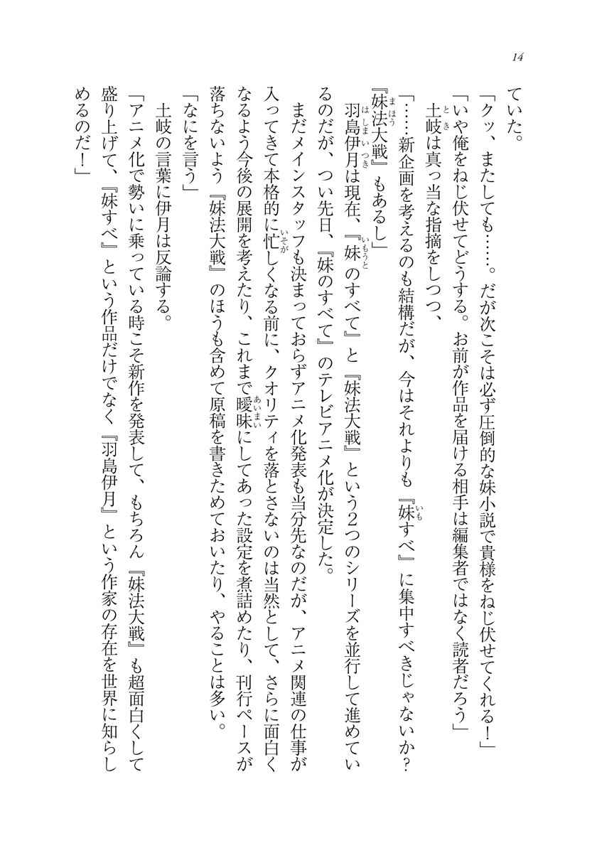 小説家VSマンガ家!? 『妹のすべて』のアニメ化が決定し、さらにはコミック化も決まり絶好調の羽島伊月。しかし満場一致でコミカライズ担当に選ばれたマンガ家・三国山蚕にはとんでもない秘密があり、それはぷりけつや可児那由多、そして何故か普通の女子大生の白川京まで巻き込んだ珍騒動へと発展していくのだった。果たして伊月は、初めてのメディアミックスという荒波を無事に乗り越えることができるのか! そして伊月と那由多との関係にもついに変化が……!? 大人気青春ラブコメ群像劇、待望の第4弾! 今、すべてを懸けた戦いの幕が上がる!