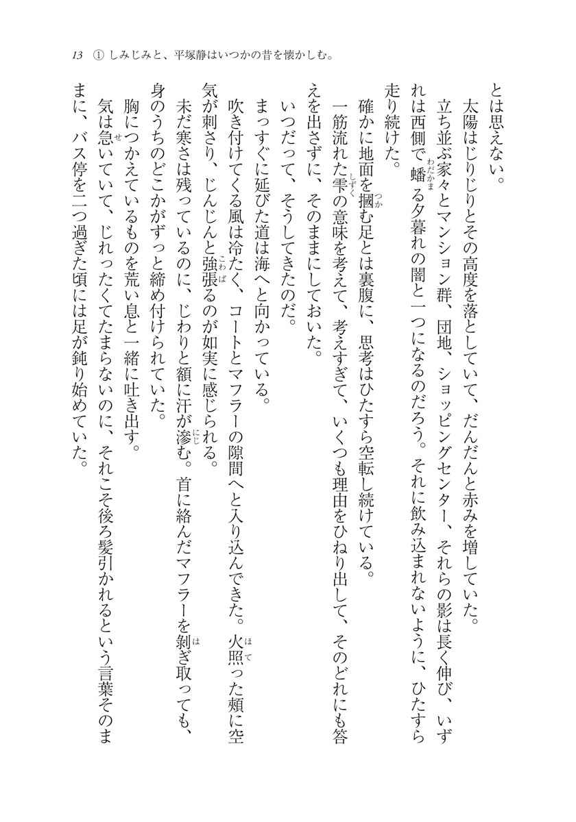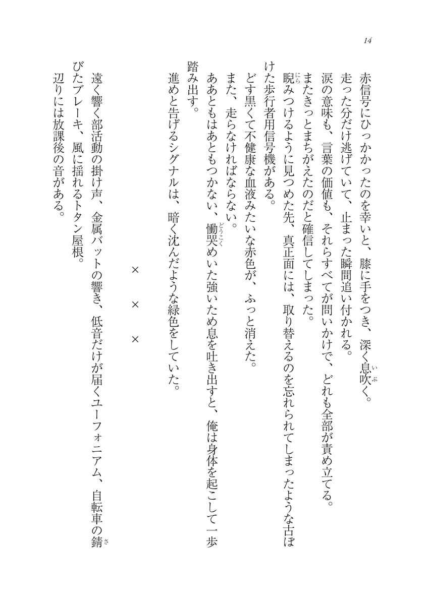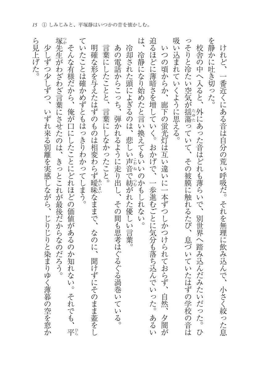 雪ノ下雪乃は、最後まで見届けて欲しいと願った。由比ヶ浜結衣は、このままずっと一緒にいられたらと祈った。美しい夕日に時が止まればと願っても、落日を迎えなければ新しい日はやってこない。前に進むために諦めること、終止符を打つこと。悩むまもなく、巻き戻すことも出来ず、エンドロールは流れ始める……。