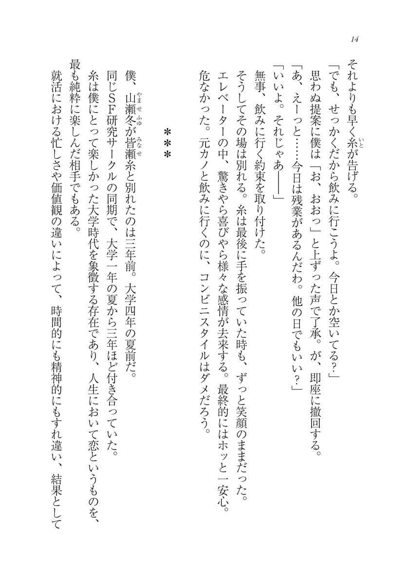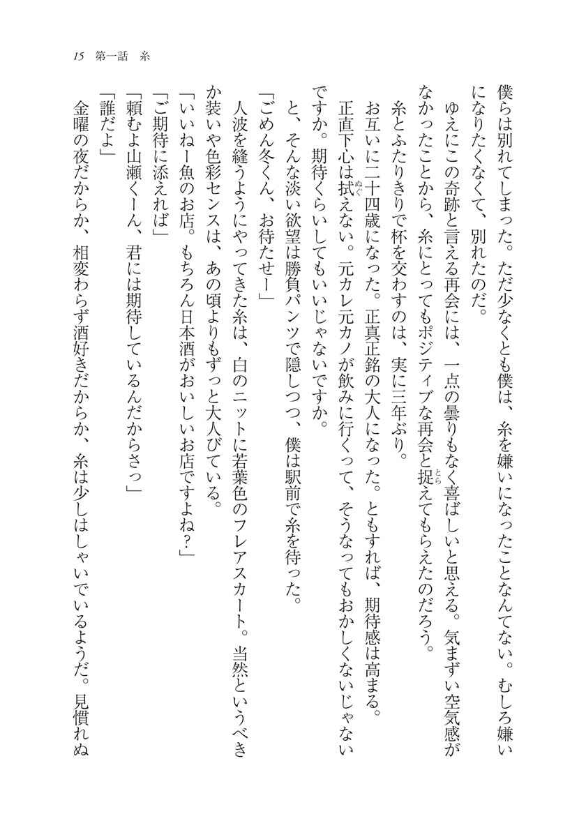 たのしくて・気を遣わない・ラフな関係。 元カノと夜を共にした。ブラックな仕事に疲れた山瀬冬は、ある日大学時代の彼女・糸と再会し飲みに誘う。愚痴や昔話に花を咲かせ、こういう友達関係もいいなと思っていた矢先、酒の勢いに呑まれてやってしまった。後悔する冬だが、糸は「謝っちゃだめ」と真剣な表情で制す。「ちゃんとしようとか言わないでよ。ただ心地良いから一緒にいようよ」糸も疲れていたのだ、社会が強要する正しさや、大人としての不自由さに。こうして二人は『仕事とか恋とか面倒なことは抜きで、ただ楽しいことだけをする』不思議な関係を結ぶ。社会に疲れたアナタに贈る、癒やしとちょっとエッチな短編連作。