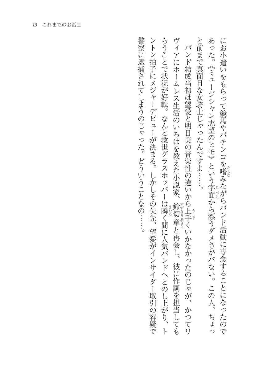 ジャンル分け不能のおもしろ群像劇第4弾! 瞬く間に人気を博しメジャーデビューを決めた救世グラスホッパーだったが、メンバー皆神望愛の逮捕によりこれまた一瞬で転落してしまう。弁護士の愛崎ブレンダはそんな望愛の弁護を引き受けることになり、惣助や閨たち探偵にも協力を依頼するーー。ジャンル分け不能のおもしろ群像劇、今度はいきなりリーガルミステリーに!? 一方、再び居場所を失ってしまった元女騎士のリヴィアは新たな寄生先と巡り逢い、中学生になったサラは友奈と一緒に楽しく学校生活を送るのだった。岐阜の街は今日も混沌と平常運転です。