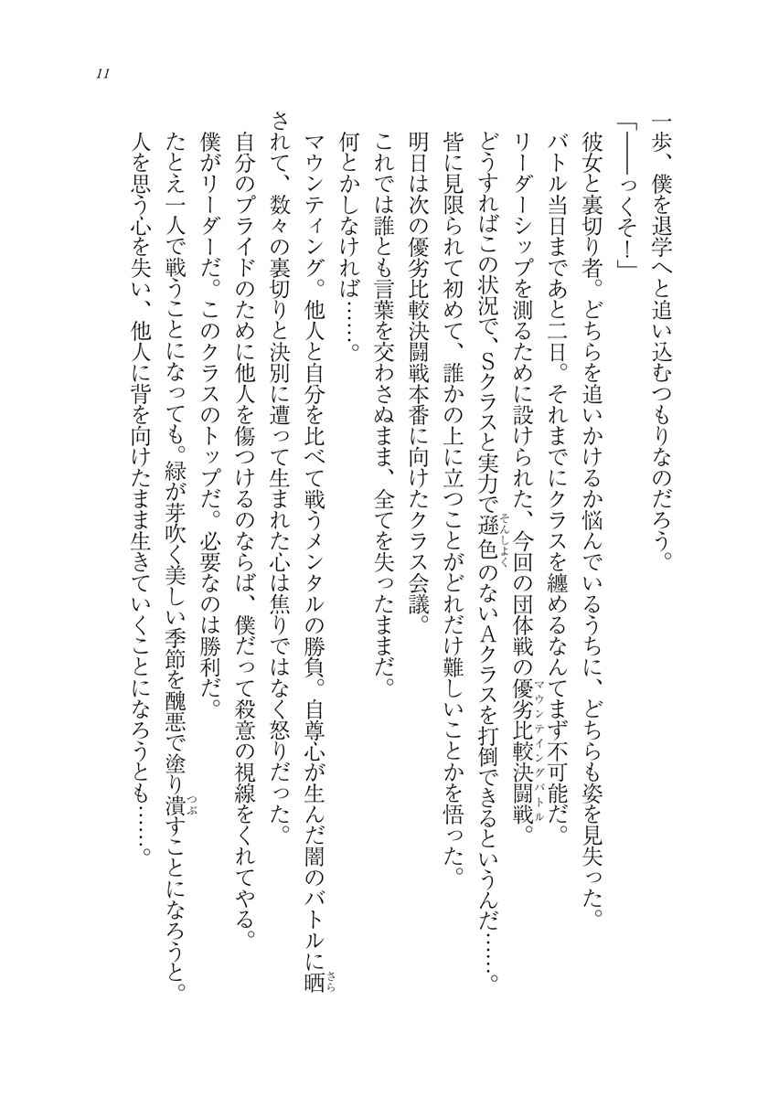 【悲報】入学早々、退学の危機!! 優劣比較決闘戦に勝利し、見事Sクラス代表を勝ち取った零。新しい環境、新しい仲間、これからの学園生活に胸を高鳴らせる。だが入学早々、Aクラス代表に宣戦布告を受けてしまう。しかも同じクラスの仲間たちは、零が代表であることに不満を持っているらしい。Sクラス代表は、負ければ退学……。慣れない環境、非協力的な仲間、そして退学の危機。ストレスに耐えかねた零が取った行動は、まさかの現実逃避!? だが学園から逃げ出した先で、たまたま居合わせた環奈となぜか温泉旅行へ行くことに。「え、これ何てラブコメ?」話題沸騰の笑える頭脳バトル、第2弾!!