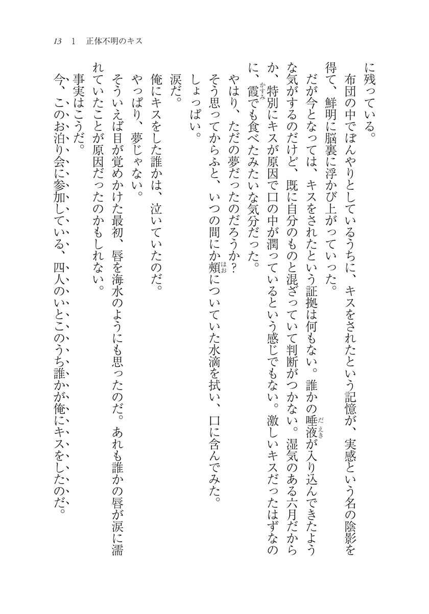 皆が寝静まったころ、幹隆は誰かにキスをされたのだ。だが暗闇の中ということもあって、誰にキスをされたのかはわからなかった。ただひとつ確かなことは、その人物が泣いていたということ。幹隆はここに至るまでの三週間のあいだに起きた出来事を一つ一つ思い出していくーー。