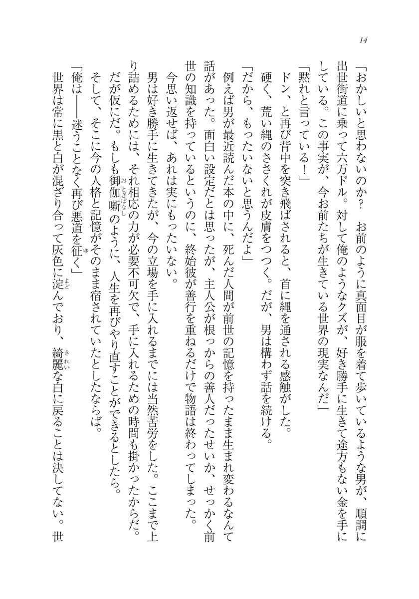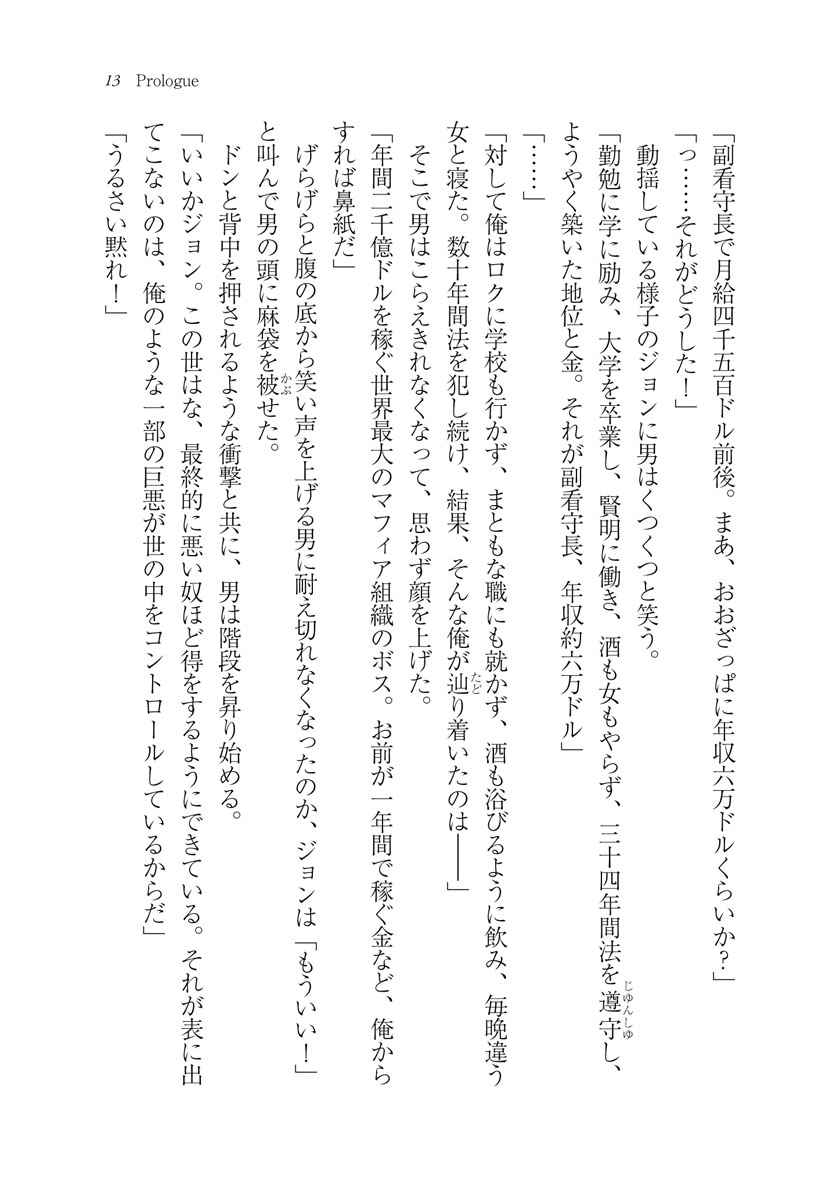 マフィアの王、異世界を蹂躙す。 晩年、裏社会の支配者として君臨した男、レオ・F・ブラッド。彼の人生は、絞首台の上で終わりを告げたーーはずだった。意識を取り戻すと、その目に映ったのは見知らぬ町、見知らぬ人々。そして、見知らぬ自分の姿。かつて裏社会を統べた男は、何の権力も持たない唯の少年へと生まれ変わっていた。生前手にしていた力は何もない。だが、揺らめくような野心の炎だけは、未だその胸を熱く焦がしている。異世界のスラム街にて二度目の生を受けたレオは、仲間を集め、再び世界を手中に収めることを決意する。生前では取りこぼした、あるモノを手に入れるためにーー。第17回小学館ライトノベル大賞優秀賞受賞作。死してなお悪道を征く、転生系ダークファンタジー。