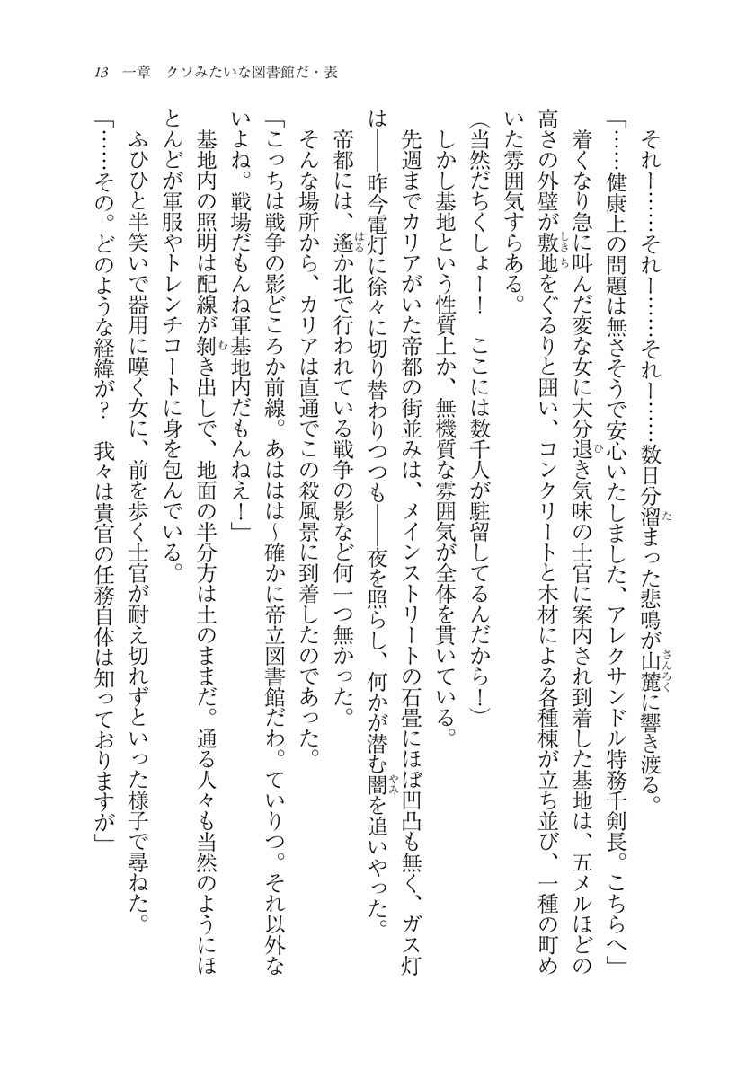 戦況を打破するため、帝国皇女は過去の遺物たる『魔導書』の管理運用を狙い、最前線には似合わぬ『基地図書館』を試験的に配置。魔導書の修復・活用をその主任務とする『魔導司書』がその運営を行うことになった。