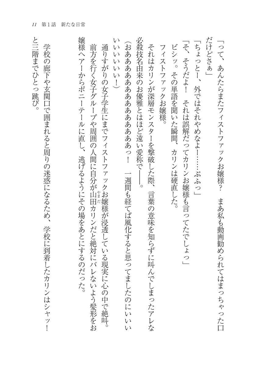 あらゆる注目を集めつづけるカリンだが、その実力はまだまだ未知数。まさかダンジョン崩壊を機に、“フィスト●ァックお嬢様”を超える伝説が生まれることになろうとは、カリン本人を含む誰も知らないのだった――。