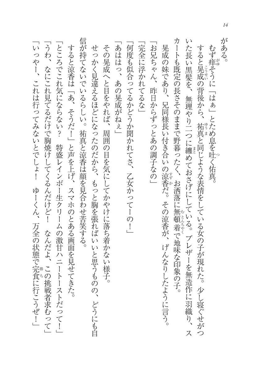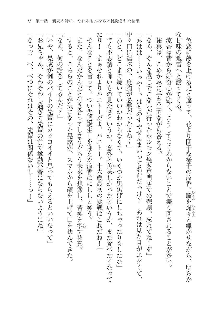 年下幼馴染と、不純な関係を持ってしまった 河合祐真には、ひとつ年下の幼馴染がいた。倉本涼香――親友・晃成の妹だ。祐真にとっても妹のような存在で、高校生になろうと変わらない。そう、思っていた・・・・・・。ある日、晃成がバイト先の先輩に恋をした。「バッカみたい」そう呟く涼香は、恋愛感情が分からないという。そして祐真も、恋愛にトラウマがあった。でも、“そういう”ことには興味がある。「キスって、気持ちいいらしいね?」いけないと分かりつつ、一線を越えてしまった。二人は、ひとつ約束を結ぶ。この不純な関係は『本当に好きな人』ができるまでの期限付き。