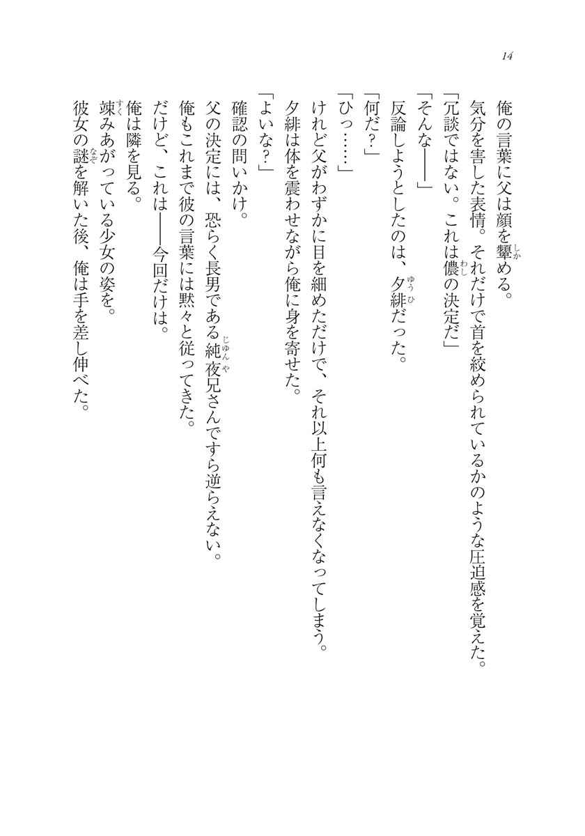 葉介は、義父にあたる混河家の当主が亡くなったという一報を受け、義妹の夕緋・由芽・瑠佳の3人とともに混河本家に向かう。当主は、当時混河家にいた兄弟姉妹たちの誰かに殺害されたらしく、葉介はその犯人探しを任される。
