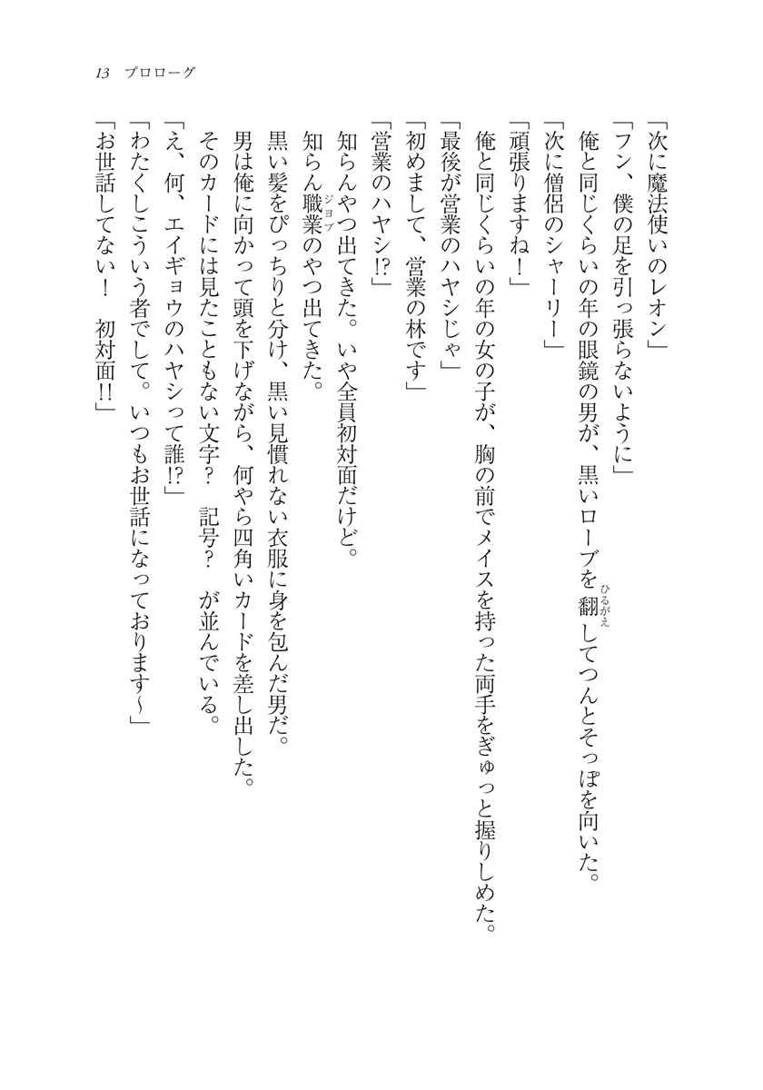 営業のハヤシが、異世界を救う!? 勇者――伝説の剣を抜き、魔王を倒すべく立ち上がった神の使途。そんな彼を支えるため、王に選ばれし仲間もまた、実力者揃いだ。戦士、魔法使い、僧侶、そして“営業のハヤシ”。「え、何、エイギョウのハヤシって誰!?」「わたくしこういうものでして。いつもお世話になっております~」「お世話してない! 初対面!!」前髪を七三でぴっちり分け、黒い衣服に身を包んだうさんくさい笑顔の彼に、驚きを隠せない勇者・アレク。これは、勇者一行が魔王を討伐するまでの日々を描いた、笑いあり、涙あり、営業のハヤシありの英雄譚。