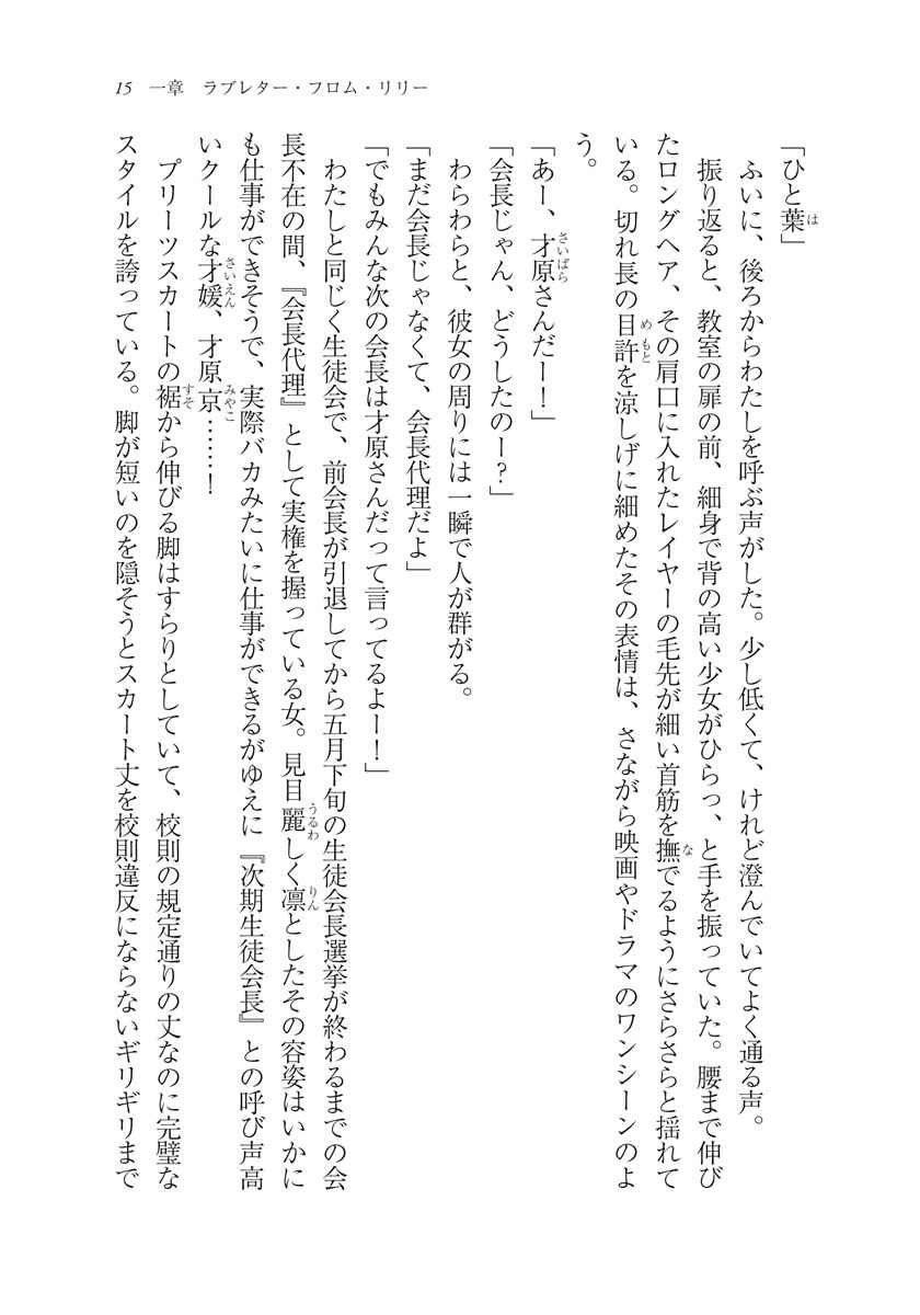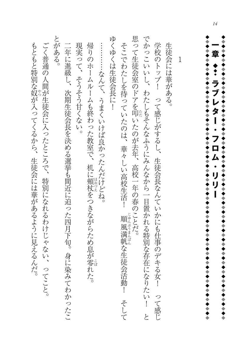 差出人は、この生徒会室にいる! 事の発端は生徒会室の引き出しに入っていた匿名のラブレター。『並木ひと葉様 あなたのことが好きです』。部屋に自由に出入りできたのは生徒会役員の3人だけ。生徒会長候補の才媛・才原京、全校生徒友達のコミュ強ギャル・小内鹿乃愛、校内のファン多数な神絵師・吉野咲姫。この中にわたしを好きな奴がいるはず……! 手紙の差出人・リリーを見つけ出すため、平凡なわたしは3人それぞれとデートすることに。でも、差出人は1人のはずなのになぜかみんな怪しくて……!? 『誰がわたしを好きなのかわからない』ガールズ・ラブコメ!