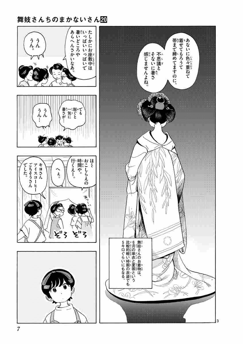 夏を迎える花街を描く花街お台所物語 京都のど真ん中、花街にある屋形でまかないさんとして暮らす少女キヨを主人公に、華やかな花街の舞台裏、普通の日のごはんを通して、温かな人間模様が描かれるお台所物語。