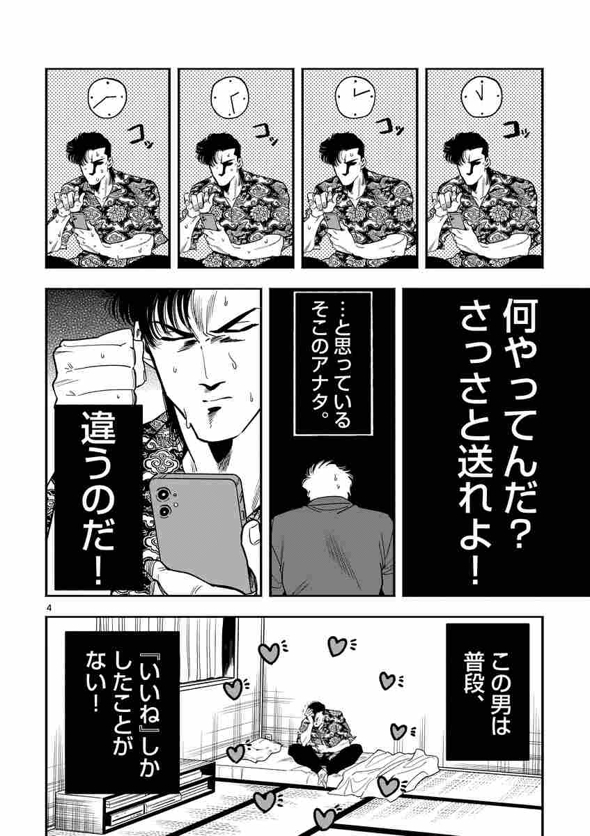 心の奥底でナッツからの返信を期待してしまう自分に嫌気がさし、自己嫌悪に陥る義男。