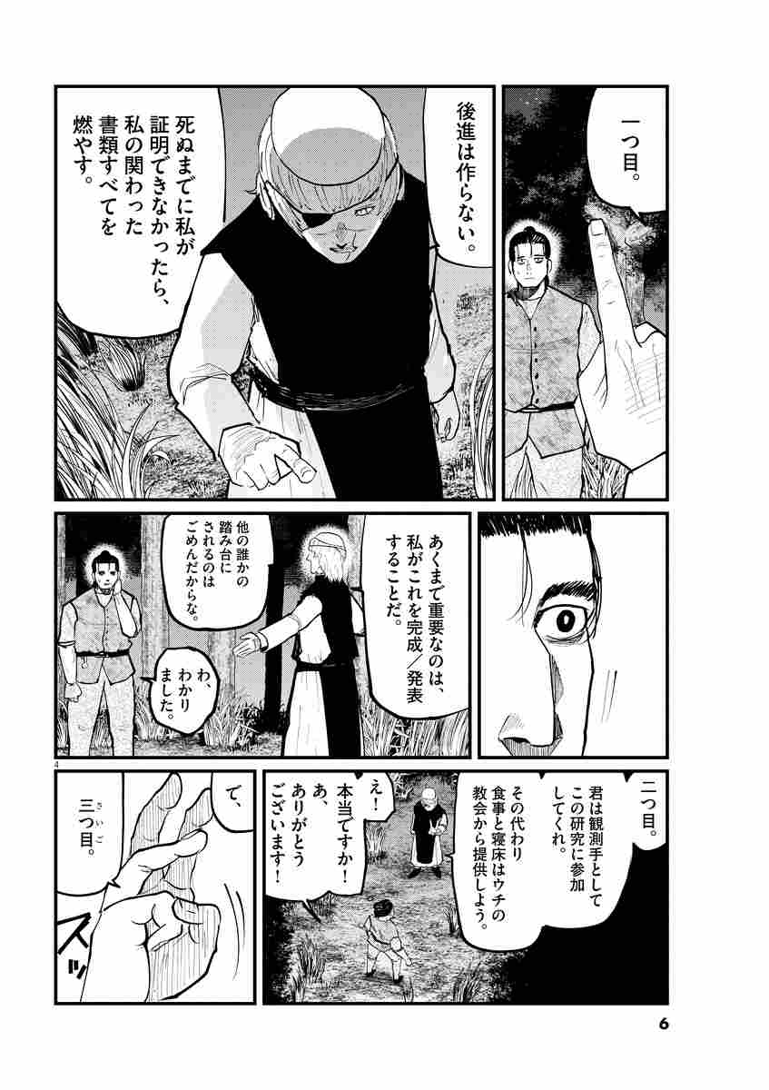 絶望の淵で、意志を穿つ、覚悟はあるか? 「地動説」に魅せられたグラスの想いを受け継いだオクジーは、一縷の希望を胸に、孤高の天才修道士・バデーニの元を訪れ、石箱を引き継ぐ。そして、オクジーとバデーニが「地動説」証明のための新たな協力者を募ったところ、「女性に学問など」という時代に押し潰され、世界に絶望する少女が一人。