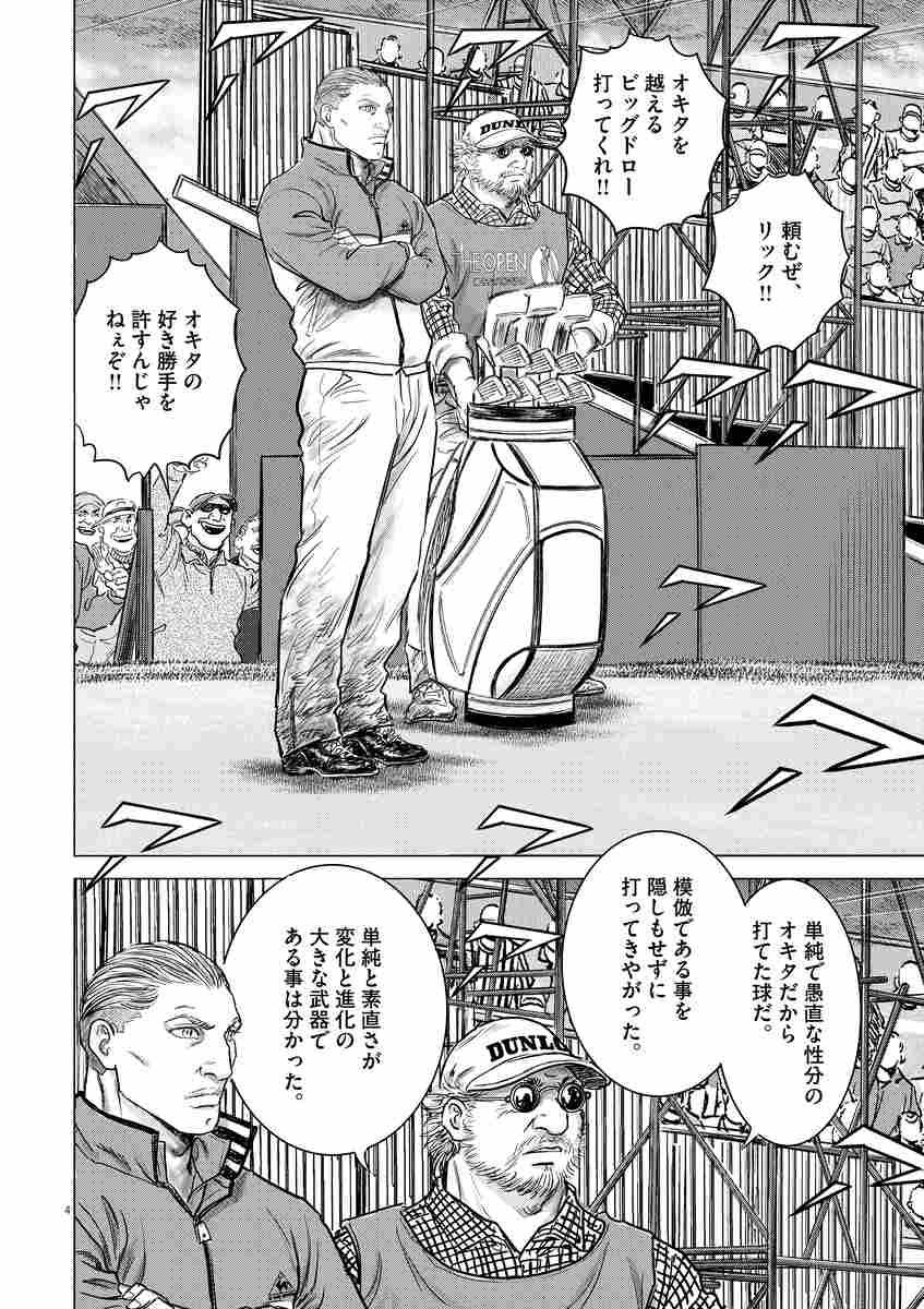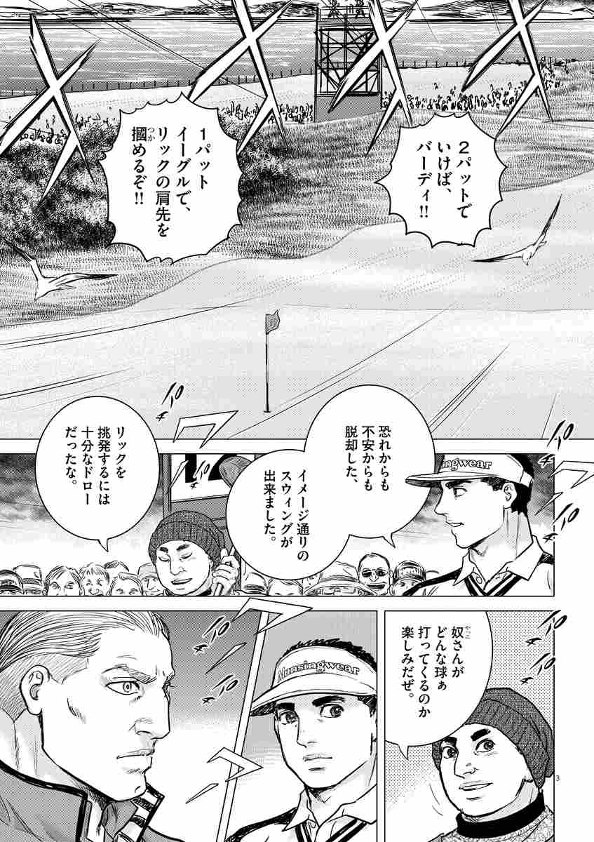 全英オープン最終日。ゴルフの聖地セント・アンドリュースはハードなコースセッティングとなっています。沖田圭介はこの状況下で首位リックに追いつくことが出来るのでしょうか。沖田のゴルフを常に意識し続ける王者ウォーレンも、虎視眈々と優勝を狙っています。沖田が熱源となって、3人はどんどん気勢をあげていきます!!