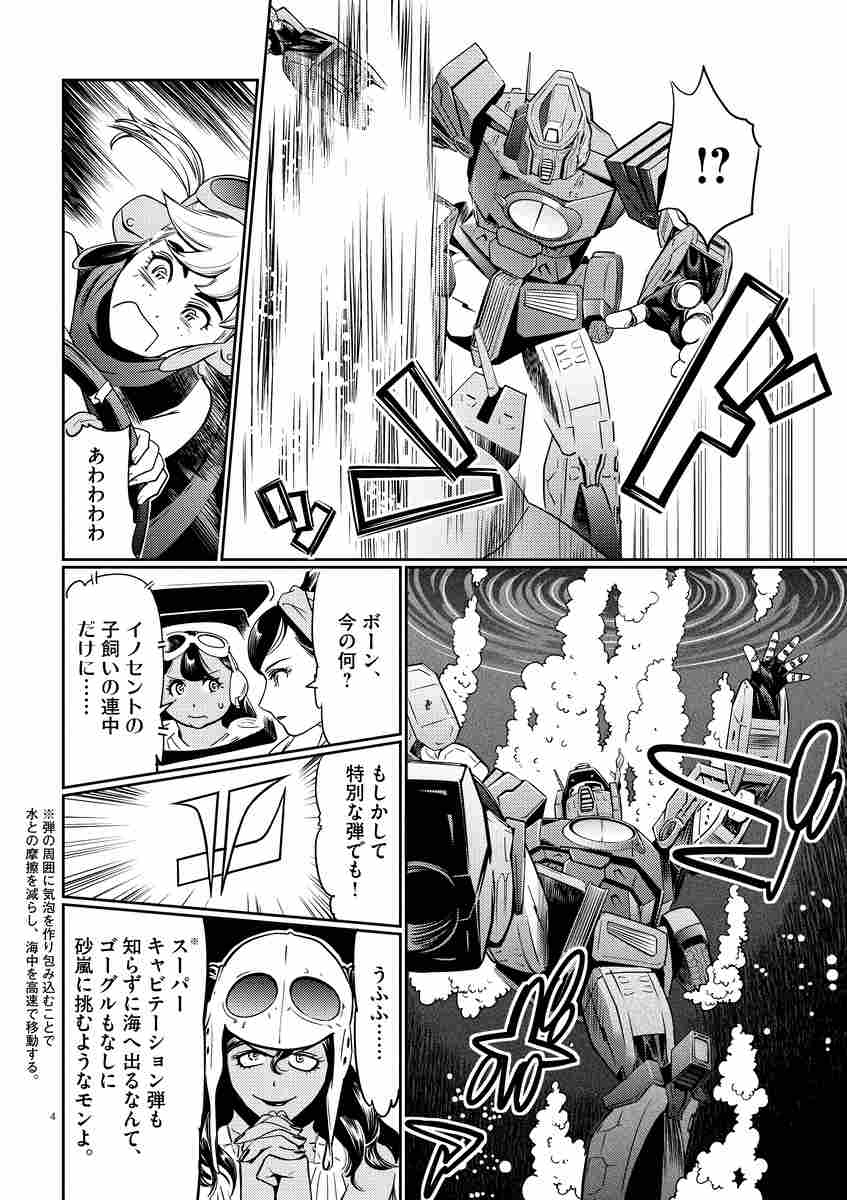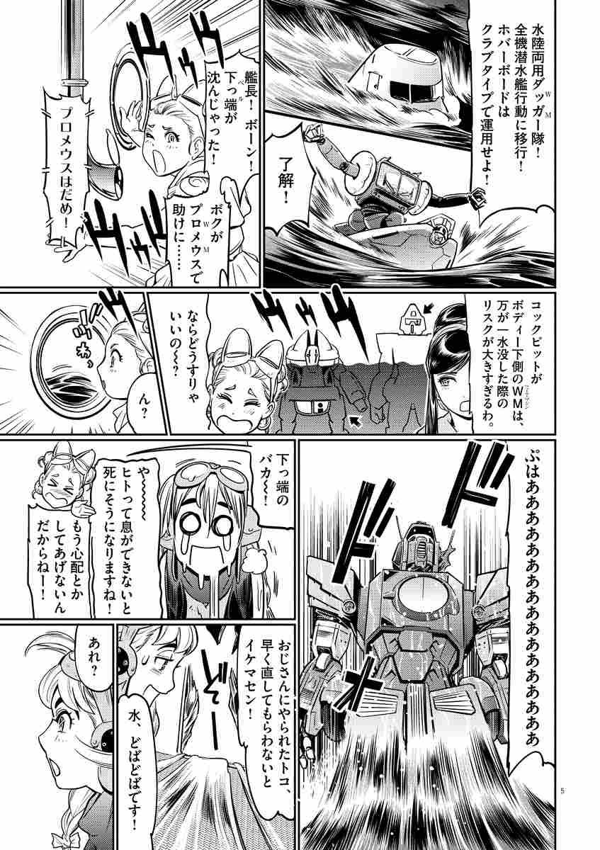 泥の海に眠る遺跡を巡ってWM大抗争!! 青い「海」を目指すベルは、外洋修理船ビスケインとそのクルーに出会って、青いウォーカーマシン(WM)ザブングルに乗ることに。