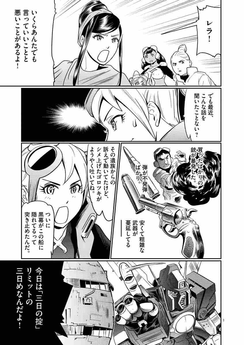 その彼女たちとウーシバ先生の医療船アンビュランの前に、ザブングル・ロッソに乗るレラが立ちはだかる。多くの死傷者を出した模造銃と粗悪弾薬の元締めがアンビュランに潜んでいるためだった。