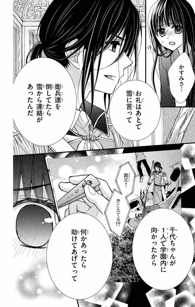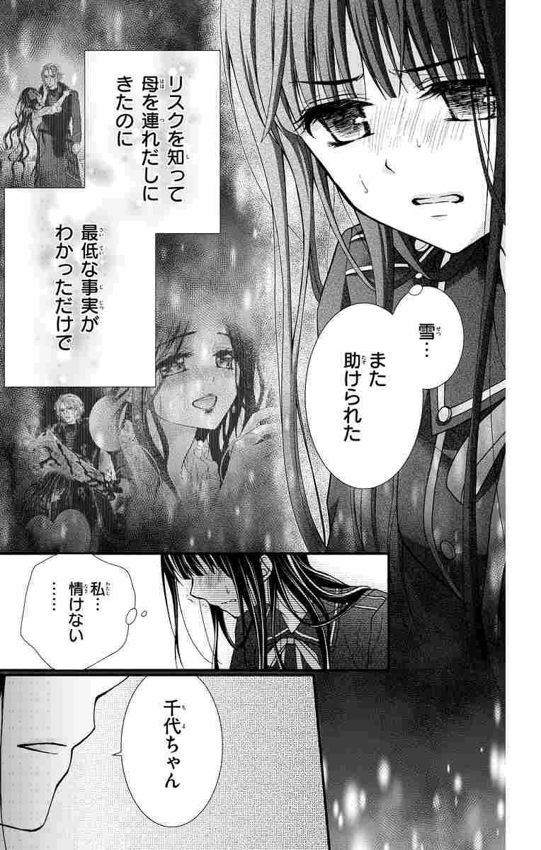 千代と霖がまさかの・・・!? 千代奪還のため、白銀家に潜入した篝月兄弟。雪は千代と無事に再会を果たし、篝月学園へ帰ろうとする。が、千代は産みの母を白銀学園から助け出すことを諦めきれない。千代の気持ちを察した雪は、白銀兄妹の長男・紅と1人で戦うことを選び、千代を母の救出に向かわせた。ようやく母と再会できた千代は、しかしある衝撃の事実を知ってしまう。絶望している千代の命を白銀家当主、さらに白銀兄妹の胡桃が狙う。絶体絶命の千代を救ったのは意外にも雪の兄、霖だった。死の淵にいる千代を、霖はある方法で助けることを決意し・・・。白銀兄妹との戦いの結末、そして千代の雪への想いがドラマチックに絡み合う!!