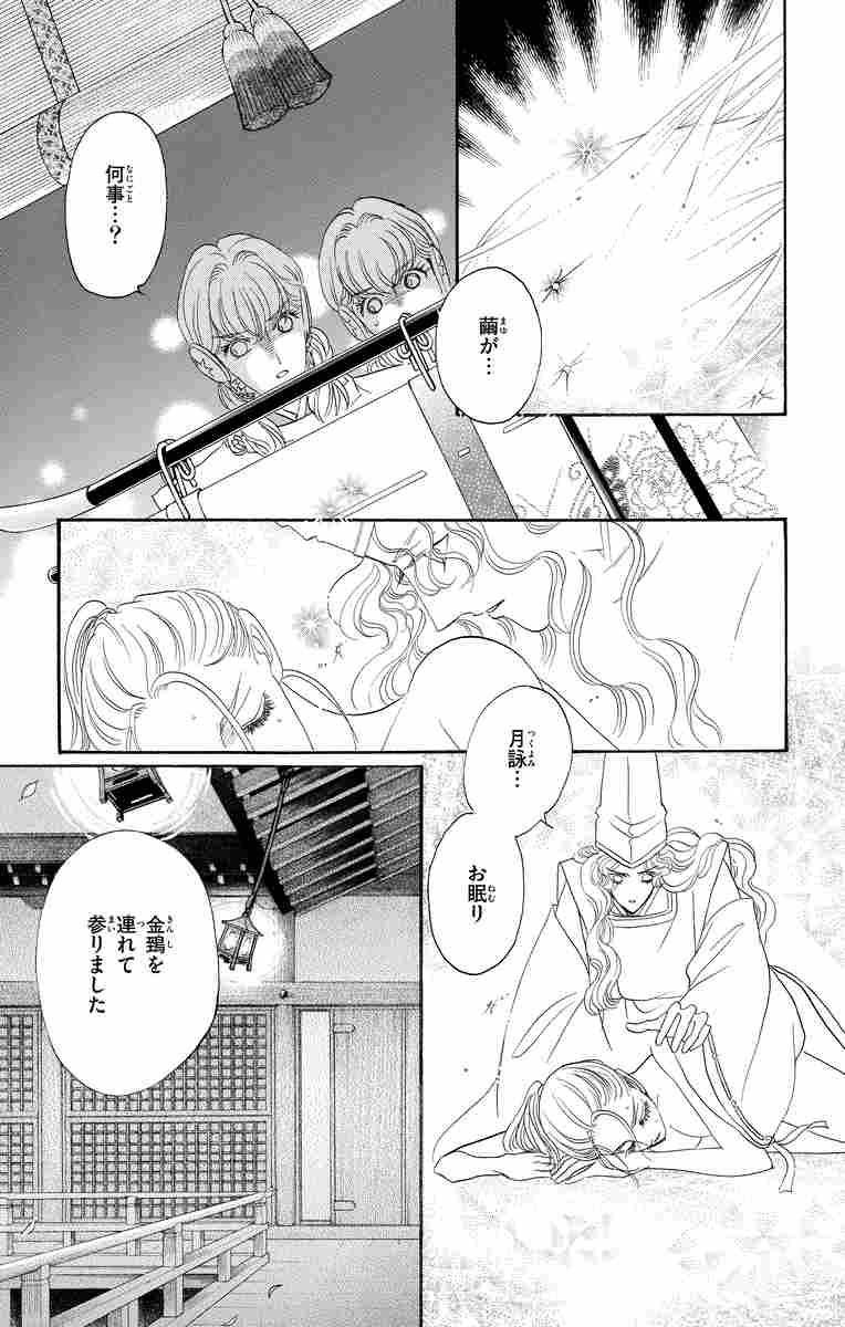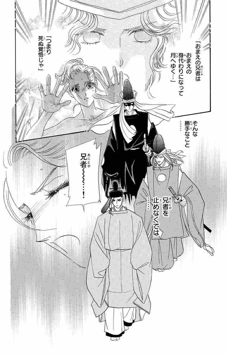 ついに来た月からのお迎え! 時は平安。次の満月に、かぐやに月からの迎えが来ようとしていた。天女の身代わりを用意して、月を欺く策を練る金鵄たち。ついに訪れた満月の夜、現れた月の使者を目前に、愛を誓い合う帝とかぐやは…? そして、繭に眠っていた月詠に変化が…?