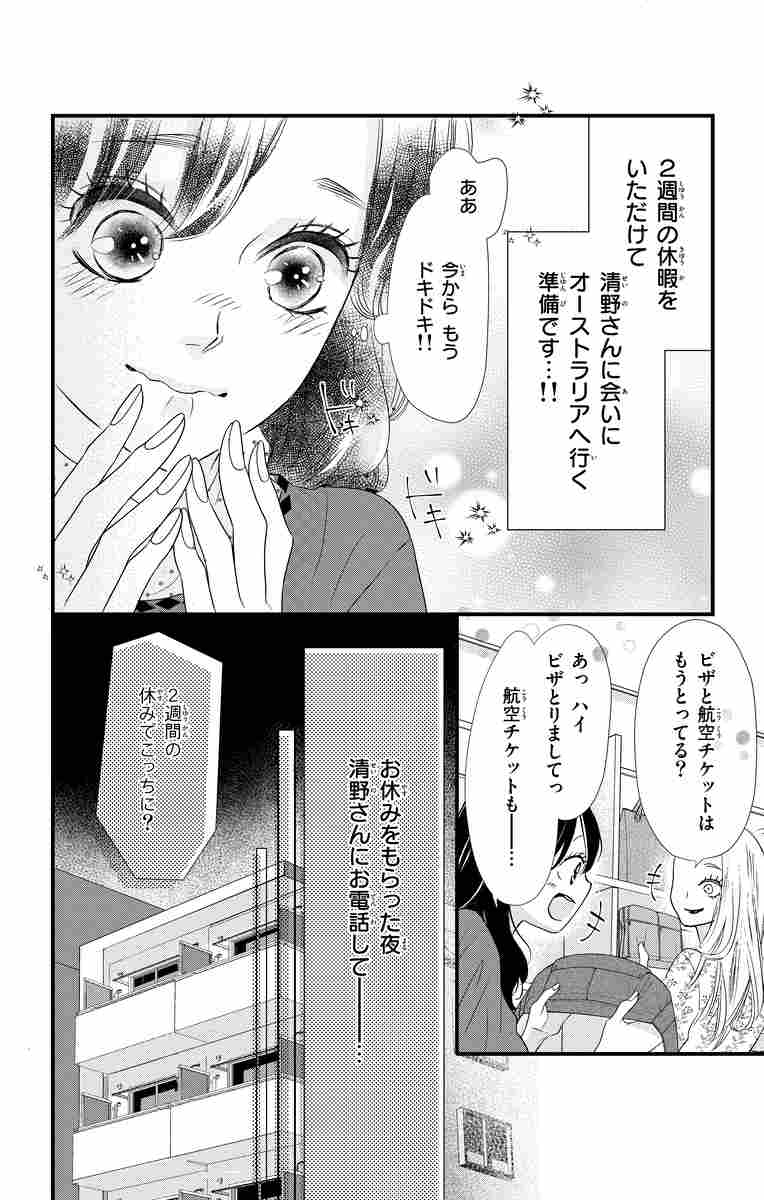 清野さんとオーストラリア旅行編開幕! 清野さんに会いに・・・オーストラリアに行きます・・・! 静と朝倉の厚意で2週間お休みをもらえた由莉。遠距離恋愛中の清野さんに会いにオーストラリアに行くことに! 久しぶりのいちゃ甘編スタートですっ!!