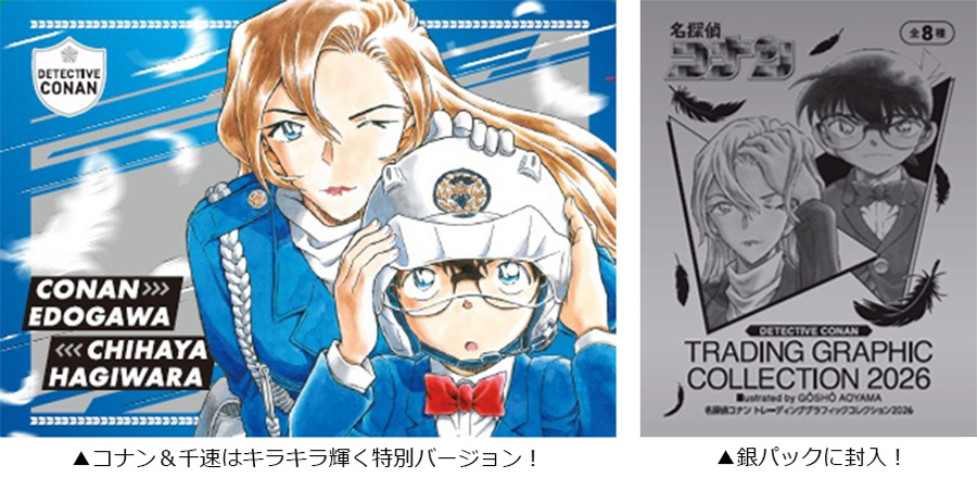 「トレーディンググラフィックコレクション2026」とは、コナン、萩原千速、横溝重悟、松田陣平&萩原研二、世良真純に園子や蘭、宮本由美、小池苗子など交通課の婦警さんなどのキャラクターたちのトレカサイズ(88mm×63mm)のカードのこと。コナンと萩原千速のカードは、キラキラ輝くホログラム仕様の特別バージョンになっている。
